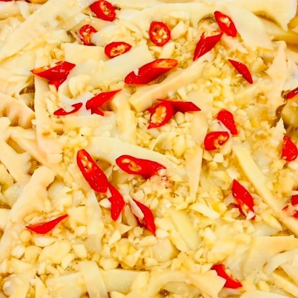 Ngâm măng: Cho măng vào hũ thủy tinh sạch, thêm tỏi, ớt rồi đổ hỗn hợp giấm vào.